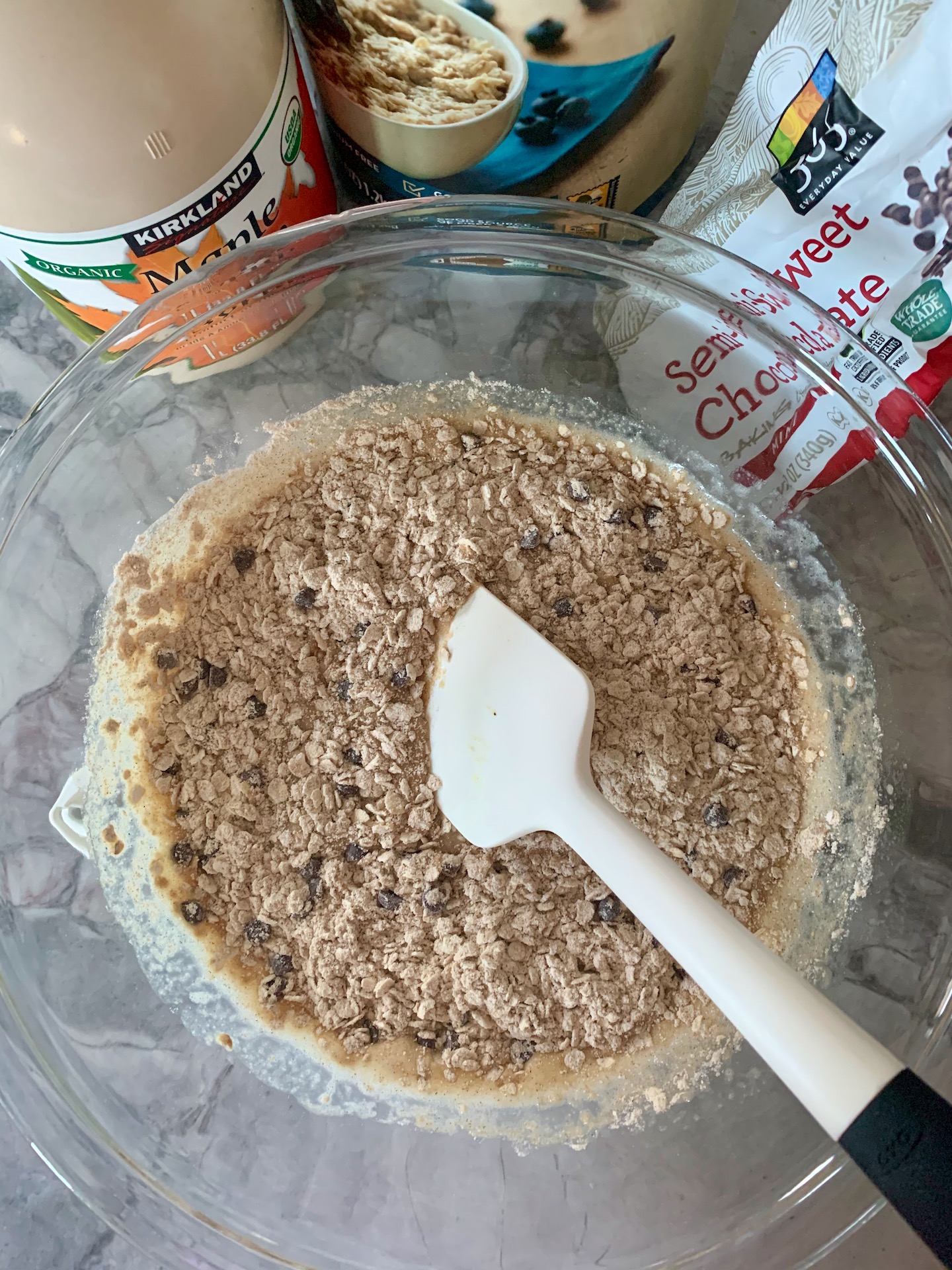Start by mashing your ripe banana, whisk in add egg, unsweetened almond milk, 1 tbsp your favorite healthy oil (we love avocado oil and buy it at Costco). Blend into the same bowl flour, oats, baking soda, baking powder, cinnamon and pinch of salt. Fold in chocolate chips.