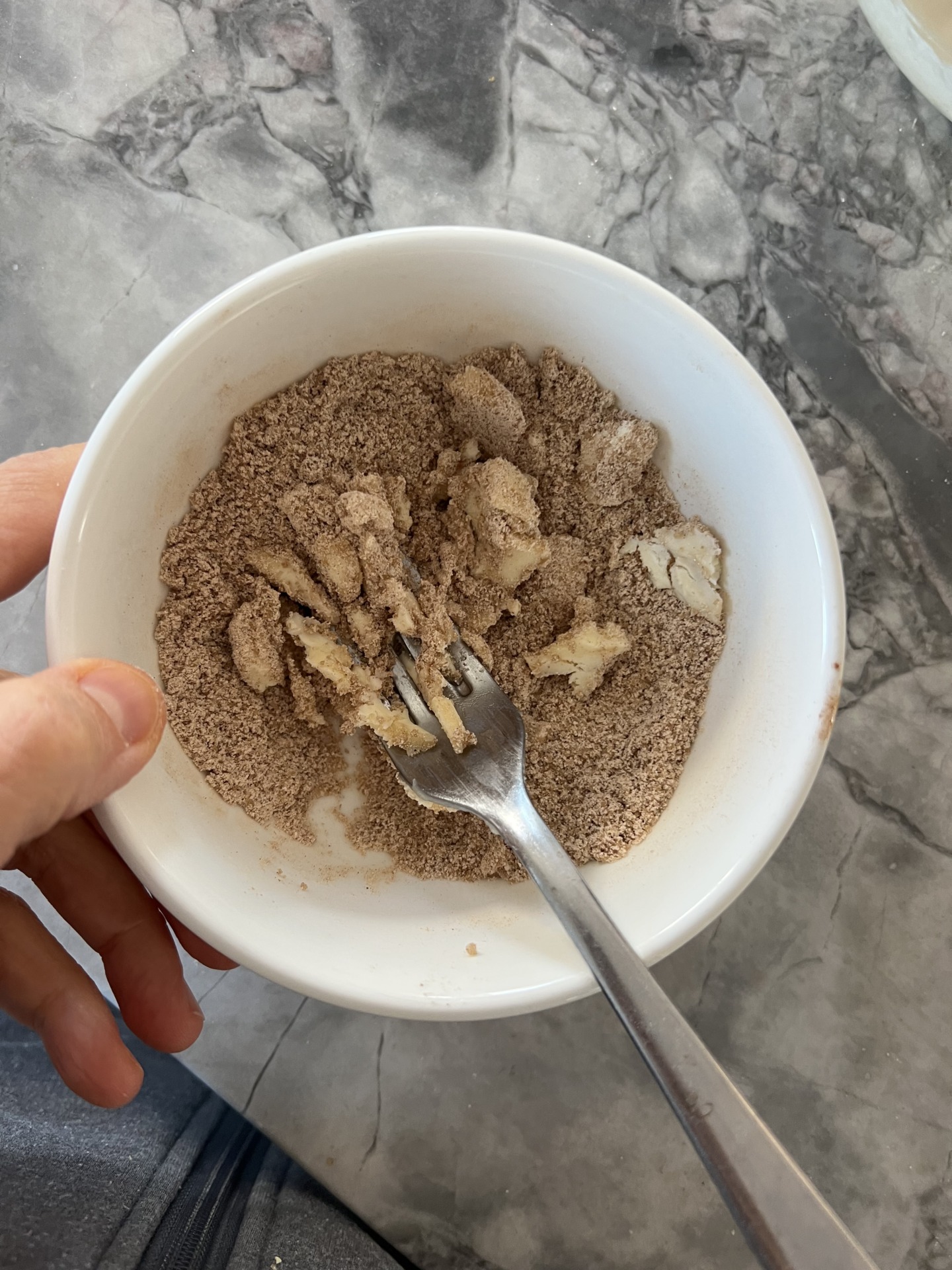 - To make the crumb layer, mix sugar, cinnamon and flour. Either pour in melted (plant) butter and stir to combine; or cut the chilled butter in with two forks (I sometimes use my hands and create butter flakes) until a coarse meal has formed.