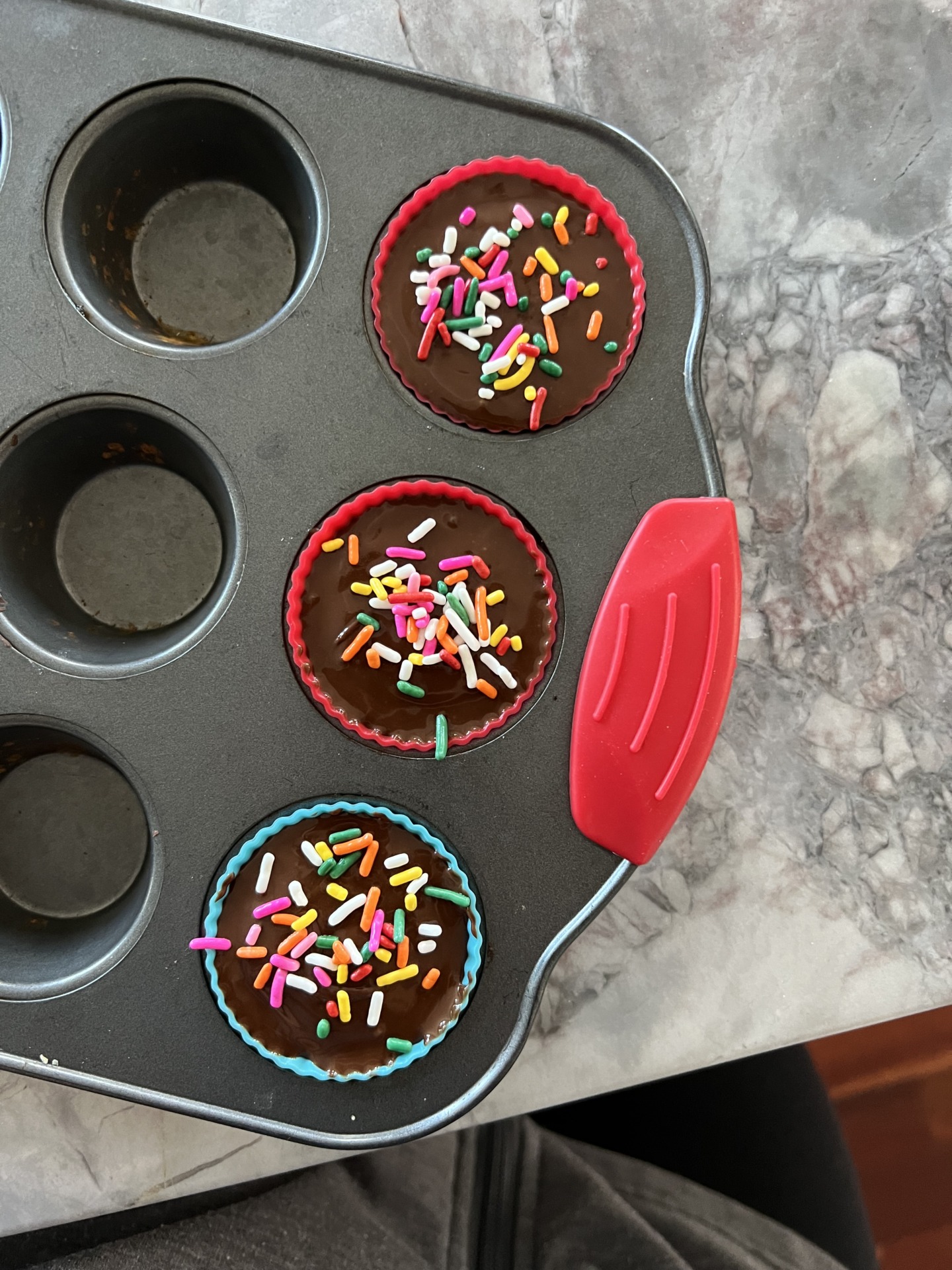 - Spread the chocolate coating on the muffin cavities evenly.